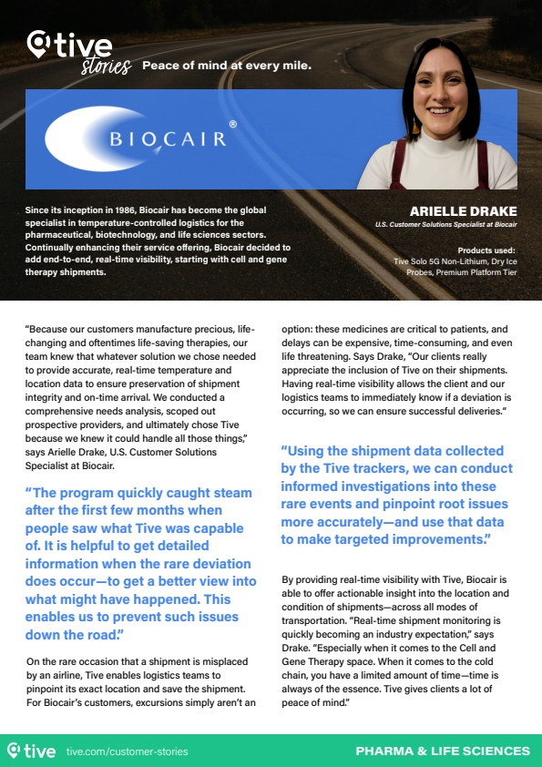 PHARMA & LIFE SCIENCES Since its inception in 1986, Biocair has become the global specialist in temperature-controlled logistics for the pharmaceutical, biotechnology, and life sciences sectors. Continually enhancing their service offering, Biocair decided to add end-to-end, real-time visibility, starting with cell and gene therapy shipments. Products used : Tive Solo 5G Non-Lithium, Dry Ice Probes, Premium Platform Tier “Because our customers manufacture precious, life- changing and oftentimes life-saving therapies, our team knew that whatever solution we chose needed to provide accurate, real-time temperature and location data to ensure preservation of shipment integrity and on-time arrival. We conducted a comprehensive needs analysis, scoped out prospective providers, and ultimately chose Tive because we knew it could handle all those things,” says Arielle Drake, U.S. Customer Solutions Specialist at Biocair. On the rare occasion that a shipment is misplaced by an airline, Tive enables logistics teams to pinpoint its exact location and save the shipment. For Biocair’s customers, excursions simply aren’t an option: these medicines are critical to patients, and delays can be expensive, time-consuming, and even life threatening. Says Drake, “Our clients really appreciate the inclusion of Tive on their shipments. Having real-time visibility allows the client and our logistics teams to immediately know if a deviation is occurring, so we can ensure successful deliveries.“ By providing real-time visibility with Tive, Biocair is able to offer actionable insight into the location and condition of shipments—across all modes of transportation. “Real-time shipment monitoring is quickly becoming an industry expectation,” says Drake. “Especially when it comes to the Cell and Gene Therapy space. When it comes to the cold chain, you have a limited amount of time—time is always of the essence. Tive gives clients a lot of peace of mind.” “The program quickly caught steam after the first few months when people saw what Tive was capable of. It is helpful to get detailed information when the rare deviation does occur—to get a better view into what might have happened. This enables us to prevent such issues down the road.” “Using the shipment data collected by the Tive trackers, we can conduct informed investigations into these rare events and pinpoint root issues more accurately—and use that data to make targeted improvements.” ARIELLE DRAKE U.S. Customer Solutions Specialist at Biocair tive.com/customer-stories Peace of mind at every mile.