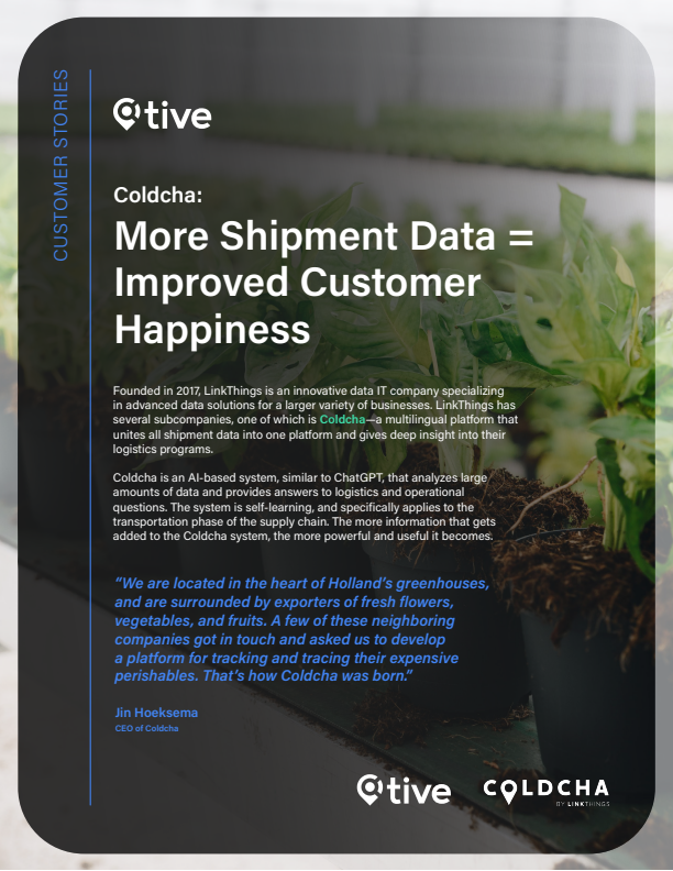 CUSTOMER STORIES More Shipment Data = Improved Customer Happiness Founded in 2017, LinkThings is an innovative data IT company specializing in advanced data solutions for a larger variety of businesses. LinkThings has several subcompanies, one of which is Coldcha —a multilingual platform that unites all shipment data into one platform and gives deep insight into their logistics programs. Coldcha is an AI-based system, similar to ChatGPT, that analyzes large amounts of data and provides answers to logistics and operational questions. The system is self-learning, and specifically applies to the transportation phase of the supply chain. The more information that gets added to the Coldcha system, the more powerful and useful it becomes. Coldcha: “We are located in the heart of Holland’s greenhouses, and are surrounded by exporters of fresh flowers, vegetables, and fruits. A few of these neighboring companies got in touch and asked us to develop a platform for tracking and tracing their expensive perishables. That’s how Coldcha was born.” Jin Hoeksema CEO of Coldcha
