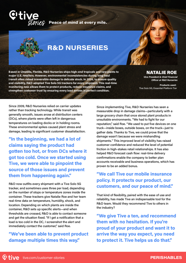 PERISHABLES Based in Umatilla, Florida, R&D Nurseries ships high-end tropicals and rare plants to major U.S. retailers. However, environmental inconsistencies during long-haul transit often risked irreversible damage to delicate stock. In 2024, to ensure quality and visibility, R&D adopted Tive Solo 5G trackers for every shipment. This real-time monitoring now allows them to protect products, reduce insurance claims, and strengthen customer trust by ensuring every load arrives in perfect condition. Since 2009, R&D Nurseries relied on carrier updates rather than tracking technology. While transit was generally smooth, issues arose at distribution centers (DCs), where plants were often left in dangerous temperatures on loading docks or in holding rooms. These environmental spikes caused plant stress and damage, leading to significant customer dissatisfaction. R&D now outfits every shipment with a Tive Solo 5G tracker, and sometimes uses three per load, depending on the number of stops or temperature zones inside the container. These trackers give Natalie Roe and her team real-time data on temperature, humidity, shock, and location. Depending on which plants are inside the container, R&D sets up specific alerts—and when thresholds are crossed, R&D is able to contact someone and get the situation fixed. “If I get a notification that a load is too cold in the DC, I screenshot the alert and immediately contact the customer,” said Roe. Since implementing Tive, R&D Nurseries has seen a measurable drop in damage claims—particularly with a large grocery chain that once stored plant products in unsuitable environments. “We had to fight for our reputation,” said Roe. “We used to put five devices on one truck—inside boxes, outside boxes, on the truck—just to gather data. Thanks to Tive, we could prove that the damage wasn’t because we were mishandling shipments." This improved level of visibility has raised customer confidence and reduced the level of potential friction in high-stakes retail relationships. It has also helped R&D forecast cash flow: real-time delivery confirmations enable the company to better plan accounts receivable and business operations, which has proven to be an added bonus. That kind of flexibility, paired with the ease of use and reliability, has made Tive an indispensable tool for the R&D team. Would they recommend Tive to others in the industry? “In the beginning, we had a lot of claims saying the product had gotten too hot, or from DCs where it got too cold. Once we started using Tive, we were able to pinpoint the source of those issues and prevent them from happening again.” “We’ve been able to prevent product damage multiple times this way.” “We call Tive our mobile insurance policy. It protects our product, our customers, and our peace of mind.” “We give Tive a ten, and recommend them with no hesitation. If you're proud of your product and want it to arrive the way you expect, you need to protect it. Tive helps us do that.” NATALIE ROE Vice President & Chief Financial Officer at R&D Nurseries tive.com/customer-stories Peace of mind at every mile. Products used : Tive Solo 5G, Essential Platform Tier R&D NURSERIES