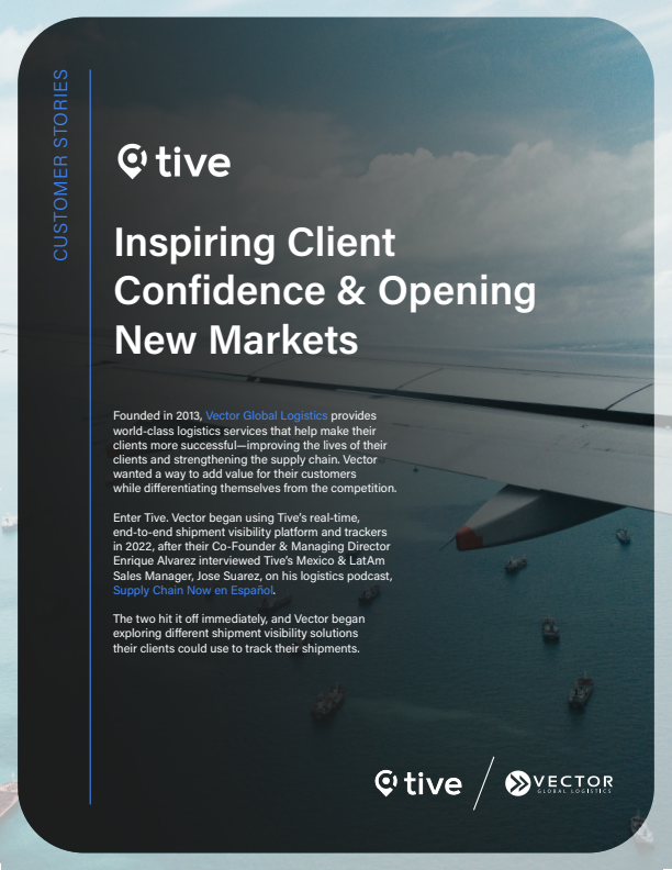 CUSTOMER STORIES Founded in 2013, Vector Global Logistics provides world-class logistics services that help make their clients more successful—improving the lives of their clients and strengthening the supply chain. Vector wanted a way to add value for their customers while differentiating themselves from the competition. Enter Tive. Vector began using Tive’s real-time, end-to-end shipment visibility platform and trackers in 2022, after their Co-Founder & Managing Director Enrique Alvarez interviewed Tive’s Mexico & LatAm Sales Manager, Jose Suarez, on his logistics podcast, Supply Chain Now en Español. The two hit it off immediately, and Vector began exploring different shipment visibility solutions their clients could use to track their shipments. Inspiring Client Confidence & Opening New Markets